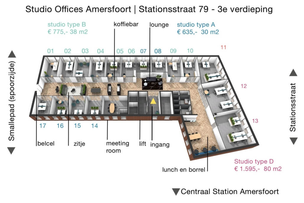 In hartje Amersfoort, op slechts enkele minuten lopen van het centraal station, vind je Studio Offices Amersfoort – een bruisende en moderne werkomgeving voor ondernemers en groeiende bedrijven. De stijlvolle kantoorstudio’s zijn volledig ingericht en bieden alles wat je nodig hebt om prettig en professioneel te werken, midden in het centrum van Nederland.