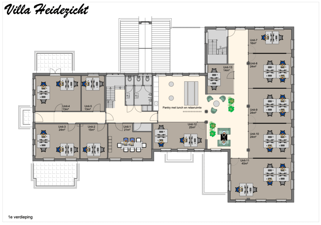 Binnen vind je gestoffeerde en afsluitbare werkplekken, moderne vergaderruimtes en een sfeervolle koffiecorner waar huurders elkaar ontmoeten. Op zonnige dagen is het buitenterras dé plek voor een ontspannen lunchmoment, en elke dinsdag kunnen huurders deelnemen aan de wekelijkse bootcamp. Villa Heidezicht combineert werken, ontmoeten en ontspannen op een manier die typisch Goois én eigentijds is.